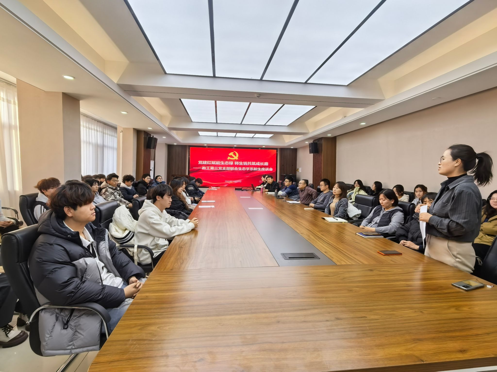 为了帮助新生切实解决专业学习与实践发展中的问题困惑,更好地搭建师生沟通交流渠道,12月15日下午,教工第三党支部联合生态学系召开师生座谈会。党员员工、任课员工代表及2025级生态班全体员工参加座谈会。座谈会由2025级生态班班主任郭金停主持。