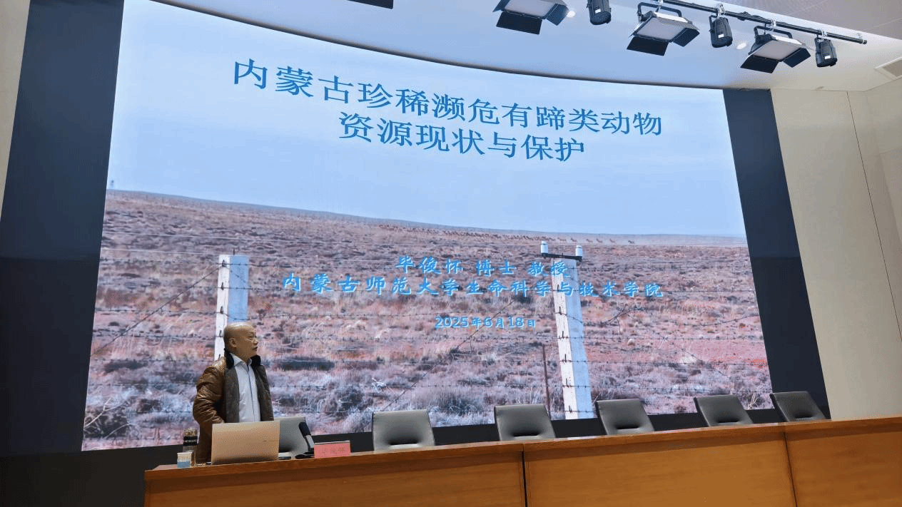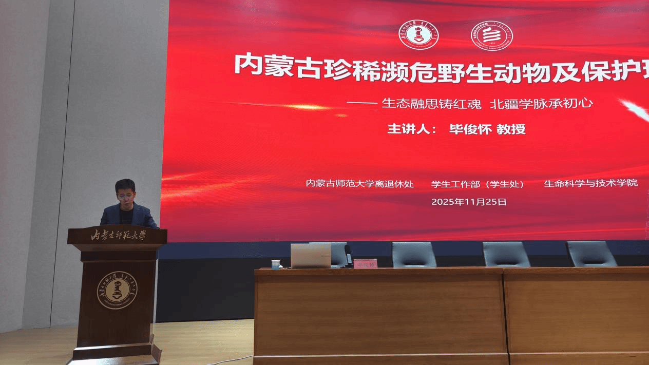 为扎实推进党建与育人工作深度融合,营造良好的学风氛围,2025年11月25日,内蒙古师范大学员工工作部(员工工作处)、离退休教职工工作处联合主办,qy球友会承办的离退休教授宣讲活动在赛罕校区信息楼学术报告厅举行。本次活动以"生态融思铸红魂,北疆学脉承初心"为主题,邀请毕俊怀教授做了题为《内蒙古珍稀濒危有蹄类动物资源现状与保护》的专题讲座。