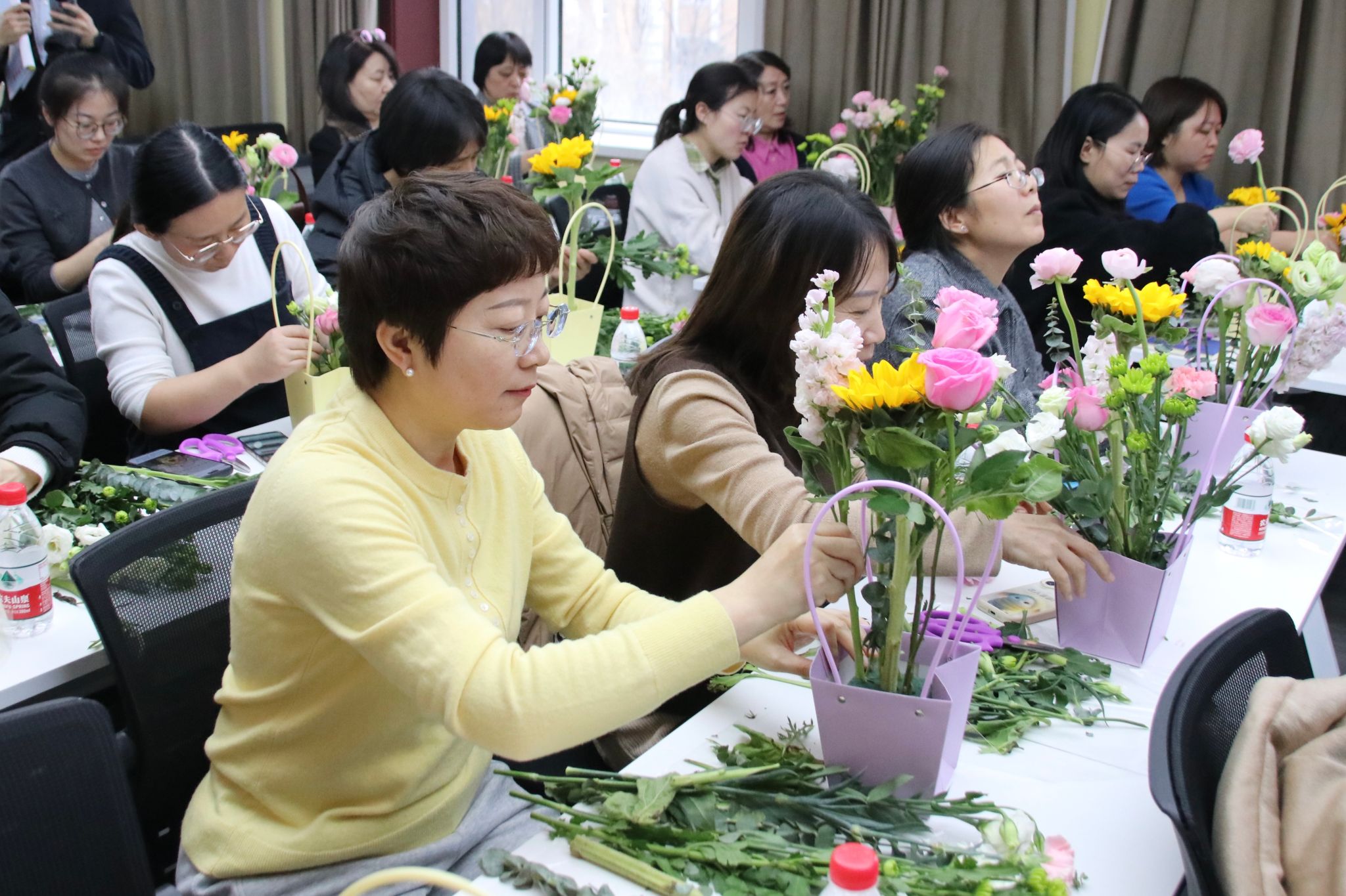 活动中,花艺老师围绕花材选择、色彩搭配和造型设计等内容进行讲解示范。在老师的指导下,大家动手修剪花枝、搭配花材、设计造型,一束束造型各异、色彩雅致的花艺作品逐渐呈现,现场气氛温馨而愉快。